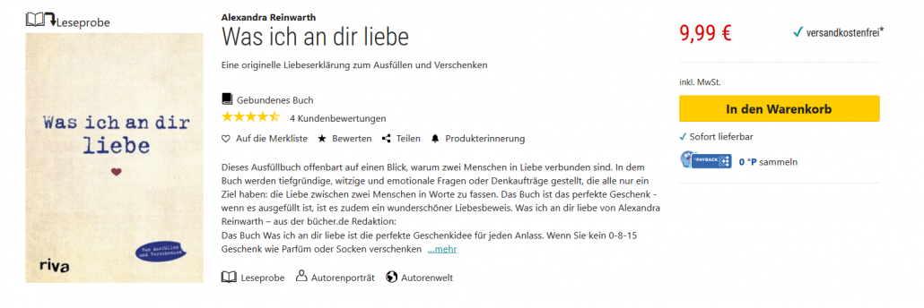 Wie wir bereits geschrieben, ist ein romantisches Geschenk etwas, dass der/dem Beschenkten zeigt: Du bist etwas Besonderes für mich. Das kann wohl kaum etwas besser, als dieses Buch zum Selbstausfüllen. Dank der Fragen darin fällt es Ihnen leicht zu ergründen, weshalb Ihr*e Liebste*r Ihnen am Herzen liegt. Und das Schönste: Er oder sie erfährt es, wenn Sie das Buch schenken.