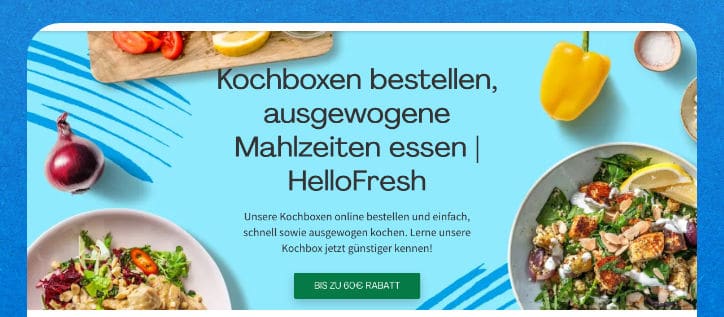 Hello Fresh ist sicher einer der bekanntesten Anbieter für Kochboxen. Die Zutaten sind immer frisch – wir haben es selbst ausprobiert – und die Portionen großzügig bemessen. Da wird jeder satt. Für Neukund*innen gibt es attraktive Rabatte.