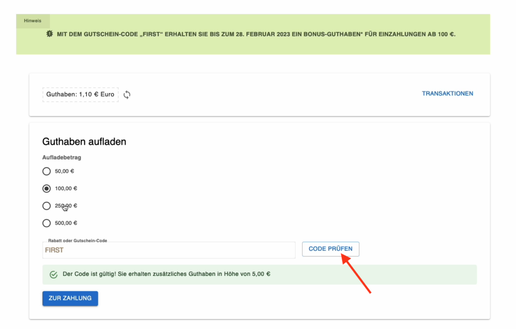 4. Wählen Sie Ihren Wunschbetrag. Um von Rabattaktionen zu profitieren, tragen Sie den oben (im grünen Kasten) angezeigten Gutschein-Code in das Feld unten ein und klicken auf „Code prüfen“. Ihr Bonus wird Ihnen sofort angezeigt.