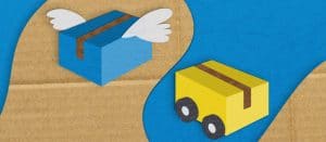 Blaues Paket mit Flügeln und gelbes Paket mit Rädern