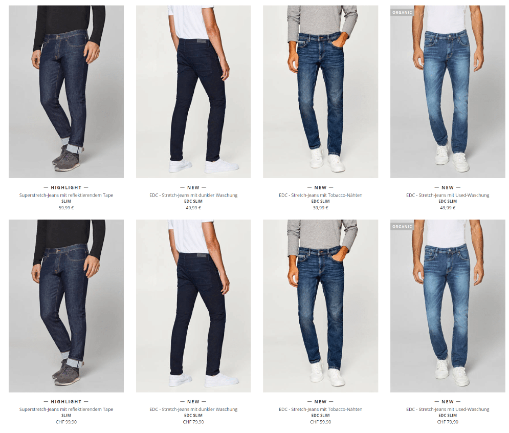 Esprit versucht nicht einmal, den Preisvergleich zwischen Deutschland und Schweiz zu erschweren. Unser Screenshot sagt ja wohl alles. In der oberen Reihe sehen Sie die deutschen und in der unteren die Schweizer Preise.