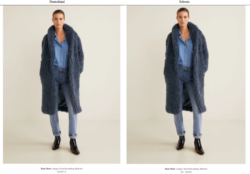 Mango geht ebenso wie H&M vor, und versucht durch eine andere Anordnung der Kleidungsstücke den direkten Preisvergleich zu erschweren. Doch eigentlich ist nur die Sortierung anders, deshalb sind schnell die gleichen Mäntel, wie in unserem Beispiel, gefunden.