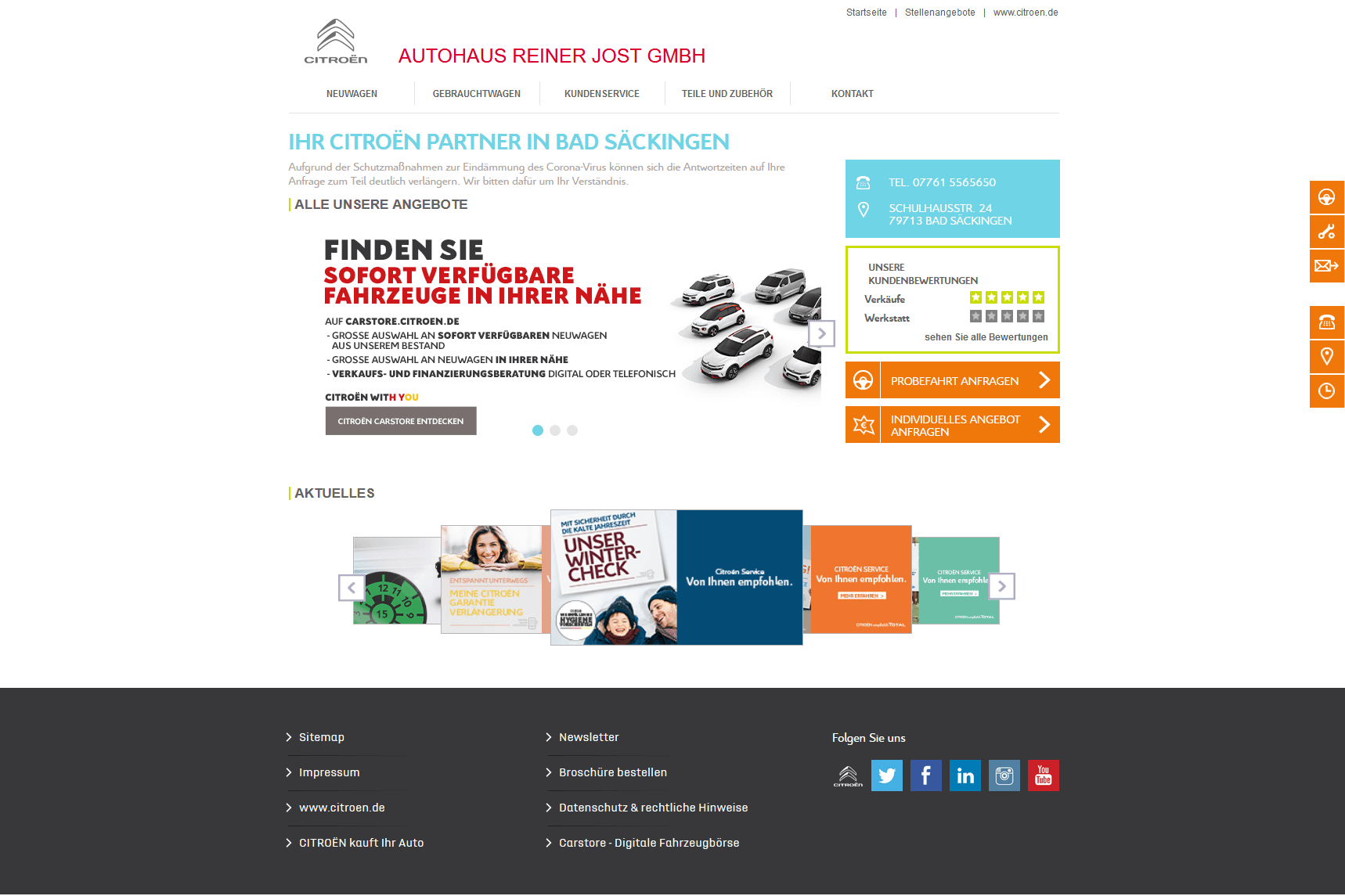 In der Schulhausstrasse 24 in Bad Säckingen liegt das Autohaus Reiner Jost. Es hat sich auf die Marke Citroën spezialisiert. Wie bei den meisten anderen Autohäusern und Garagen können Sie auch hier Ihre Service- und Werkstatttermine online vereinbaren.