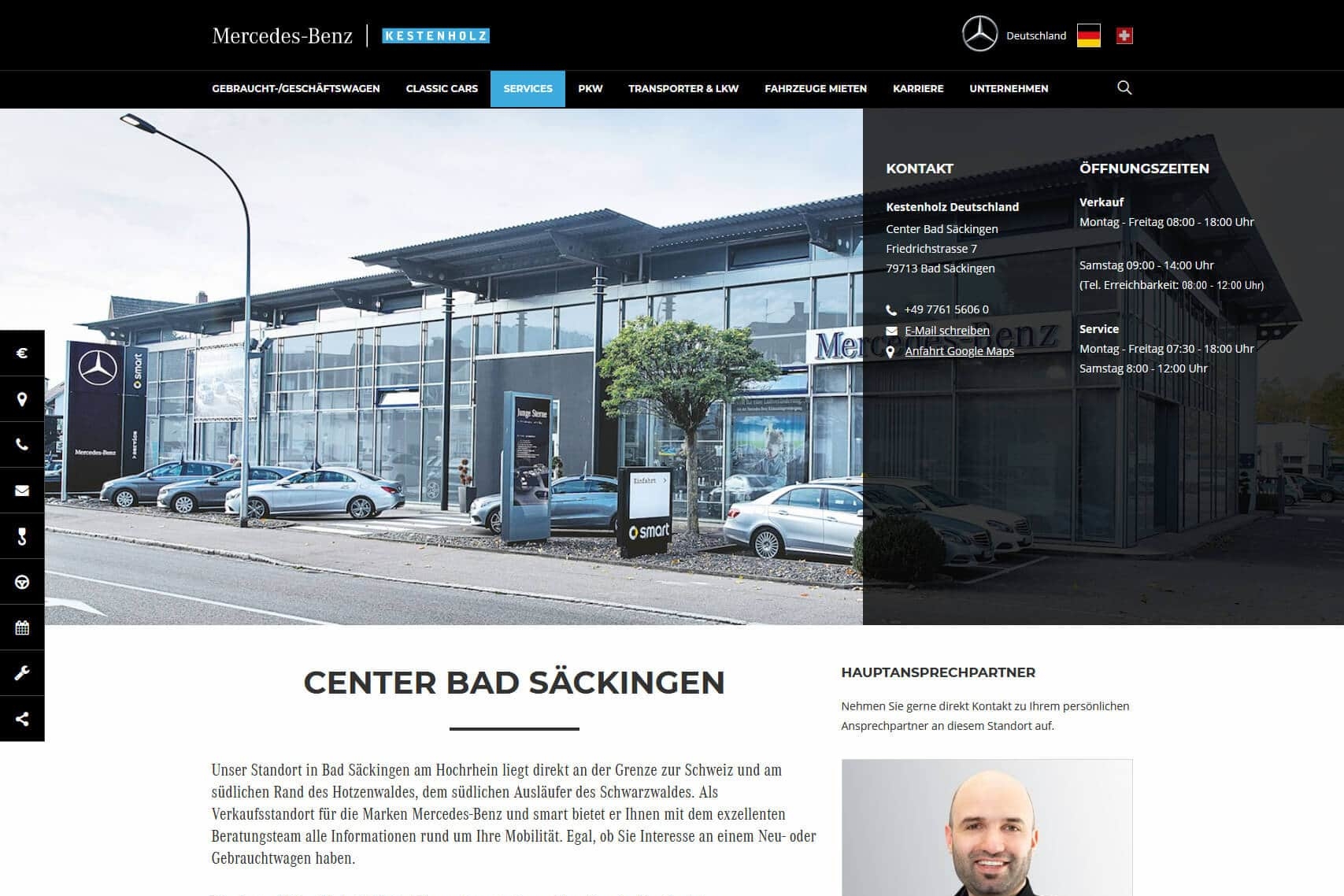 Die Firma Kestenholz Mercedes-Benz ist eine feste Grösse in der Region und zwar auf beiden Seiten der Grenze. Den deutschen Standort in Bad Säckingen finden Sie in der Friedrichstrasse 7. Neben dem Verkauf der Marken Mercedes-Benz finden Sie hier eine Werkstatt. Sie bietet alle Arten an Reparaturen, Wartungen sowie Reifendiensten. Auch ein Reifenhotel gehört zum Service-Angebot. Servicetermine vereinbaren Sie am besten Online oder per Telefon.
