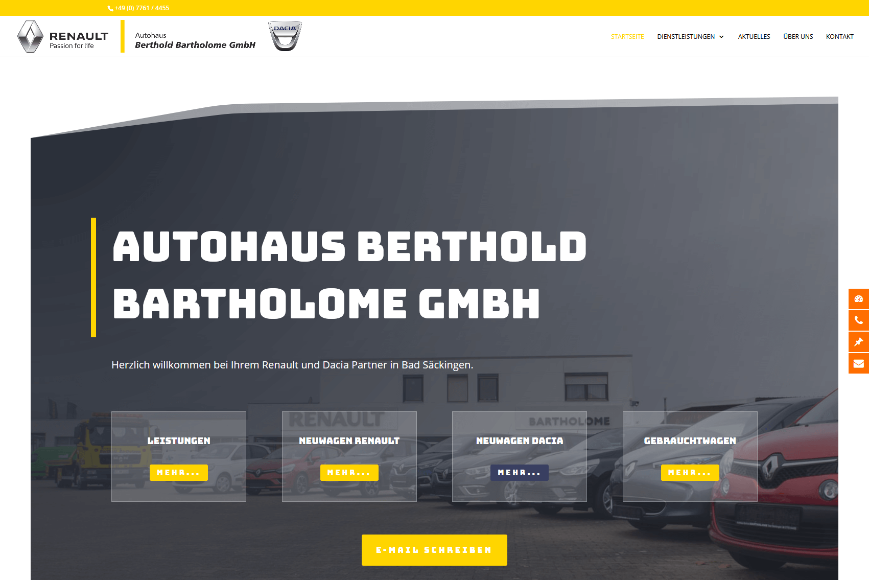 Das Autohaus Bartholome hat sich auf Neuwagen von Renault und Dacia spezialisiert. Auch Gebrauchtwagen sind hier erhältlich. Serviceleistungen werden in der Werkstatt des Autohauses erbracht. Sie finden es in Bad Säckingen in Am Buchrain 17.