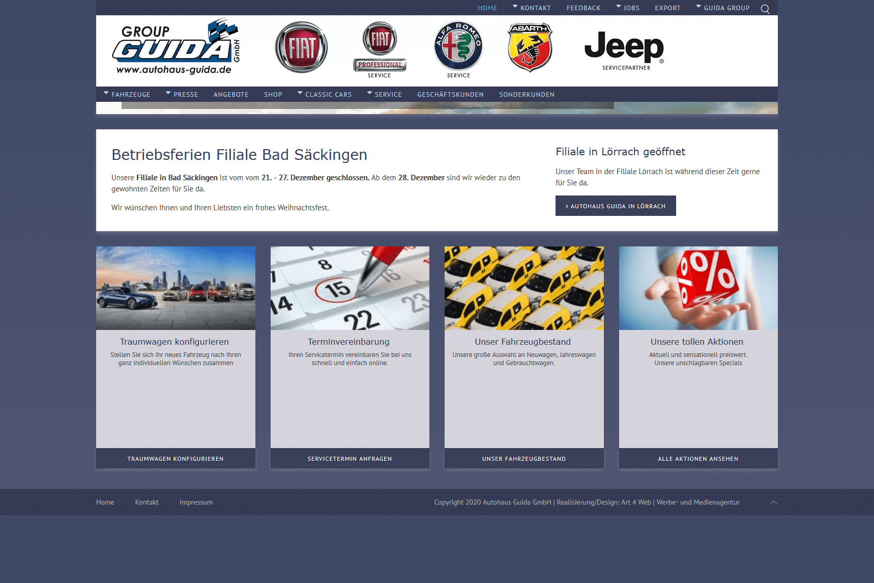 Das Autohaus Guida hat Geschäftsstellen in Bad Säckingen und Lörrach. In beiden handelt es mit Fahrzeugen der Marken Fiat, Alfa Romeo und Jeep sowie Abarth. Zu den Serviceleistungen gehören unter anderem Reparaturen, Karosserieumbau, Tuning oder auch Klimaservice. Servicetermine können Sie online für einen der beiden Standorte vereinbaren.