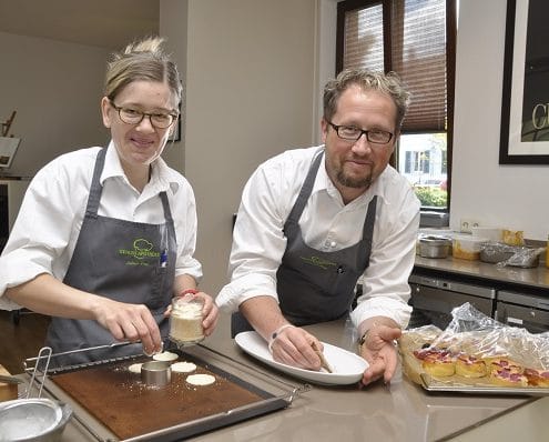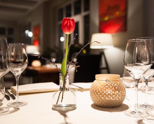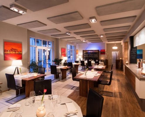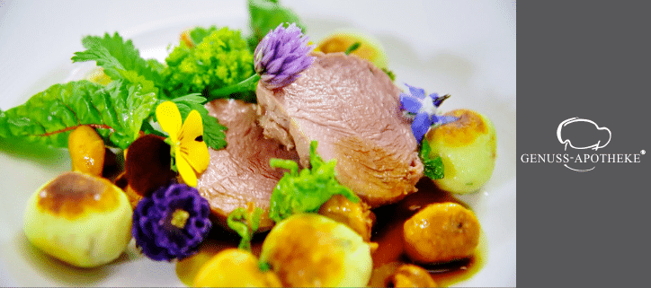 Rund 20 Gäste finden in der Genuss-Apotheke Platz. Der Blick in die offene Küche ist ein Genuss. Wir schauen Küchenchef Raimar Pilz und seinem Team bei der Arbeit zu, während wir uns unterhalten. Faszinierend finden wir, welch entspannte Atmosphäre dennoch herrscht. Absolut ruhig und hochkonzentriert arbeiten die Profis. Von Küchenhektik in einem der stressigsten Berufe, die es gibt, keine Spur. Nicht mal Sonderwünsche bringen das Team in Verlegenheit. Wer beispielsweise ein vegetarisches Menü wünscht, wird keinesfalls enttäuscht.
