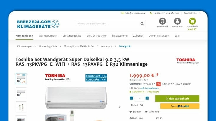 Die zweitplatzierte Klimaanlage im Test ist leider nicht viel preiswerter. Es ist die RAS-13PAVPG-E / RAS-13PKVPG-E von Toshiba. 4 Sie erhielt die Note 2,4 und kostet um die 2200 Euro/2400 CHF. Bei Breeze24 ist diese Anlage beispielsweise bestellbar.