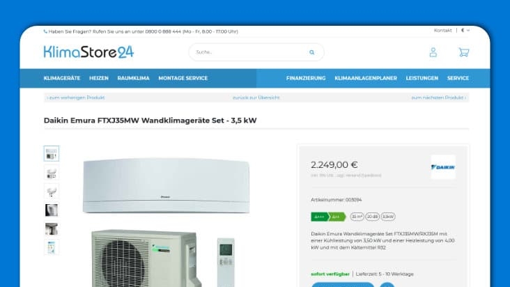 Die Stiftung Warentest hat in der Ausgabe 6/2021 Klimaanlagen-Splitgeräte einem Test unterzogen. Testsiegerin wurde mit dem Qualitätsurteil Gut (2,1) die FTXJ35MW / RXJ35M von Daikin.4 Die kostet circa 2500 Euro/2740 CHF und kann beispielsweise bei KlimaStore 24 bestellt werden.