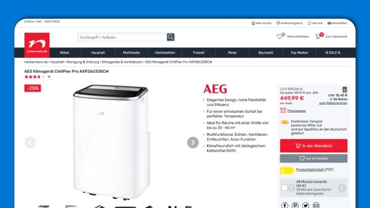 - vgl. “10 mobile Klimageräte im Test 2020. Abkühlung auf Rädern”, vom 13.7.2020, https://www.haus-garten-test.de/test/testswohnzimmer/klimageraete-test-2020/, Abruf: 11.06.21