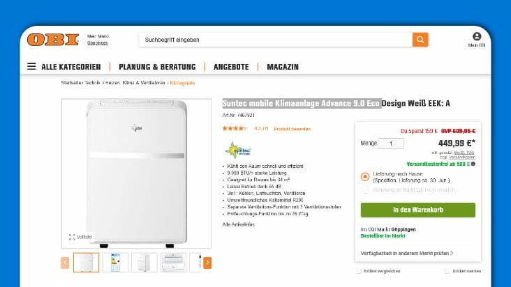 Im Test von “Haus & Garten Test” konnte sich die Suntec Advance 9.0 Eco als Siegerin durchsetzen.6 Die gibt es für circa 500 Euro/550 CHF im Handel. Bei Obi ist die online verfügbar.