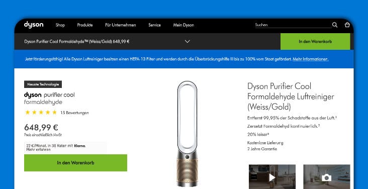 Wir haben einige Turmventilatoren bei MyPaketshop im Einsatz. Im Büro steht unser Liebling, der Dyson Purifier Cool Formaldehyde Luftreiniger. Der überzeugt als klassischer Ventilator mit tollem Luftstrom sowie als Luftreiniger, der sogar Formaldehyde aus der Raumluft holt und natürlich Pollen, Viren etc.
