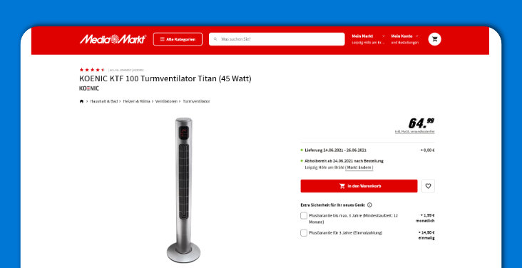 Bei den Turmventilatoren wurde der Koenic KTF 100 Testsieger bei Stiftung Warentest. Er bekam die Note Gut (2,1). Neben seinem leisen Betrieb freute die Tester, dass er sein Display abdunkeln kann. So stört er im dunklen Schlafzimmer nicht.3