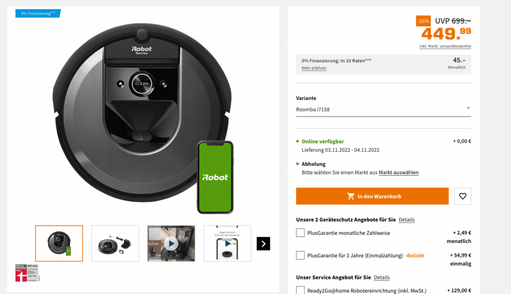 02.11.22 (11:20 Uhr): 449 Euro für IROBOT Roomba i7158
