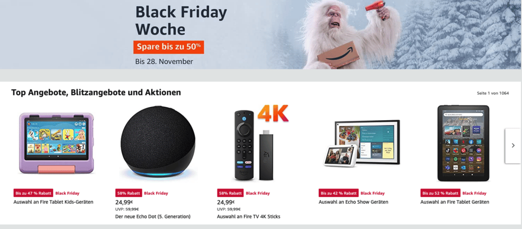 Auf Amazon startet heute die Black Friday Week. Bis zum 25.11. (eigentliche Black Friday) gibt es jede Menge Rabatte. Gerade Amazon-Geräte wie Fire-TV-Stick oder Fire Tablets sowie Smartspeaker sind jetzt besonders günstig.