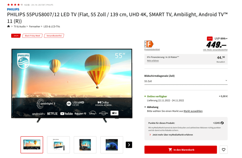 18.11.22 (11:45 Uhr): 449 Euro für PHILIPS 55 Zoll TV