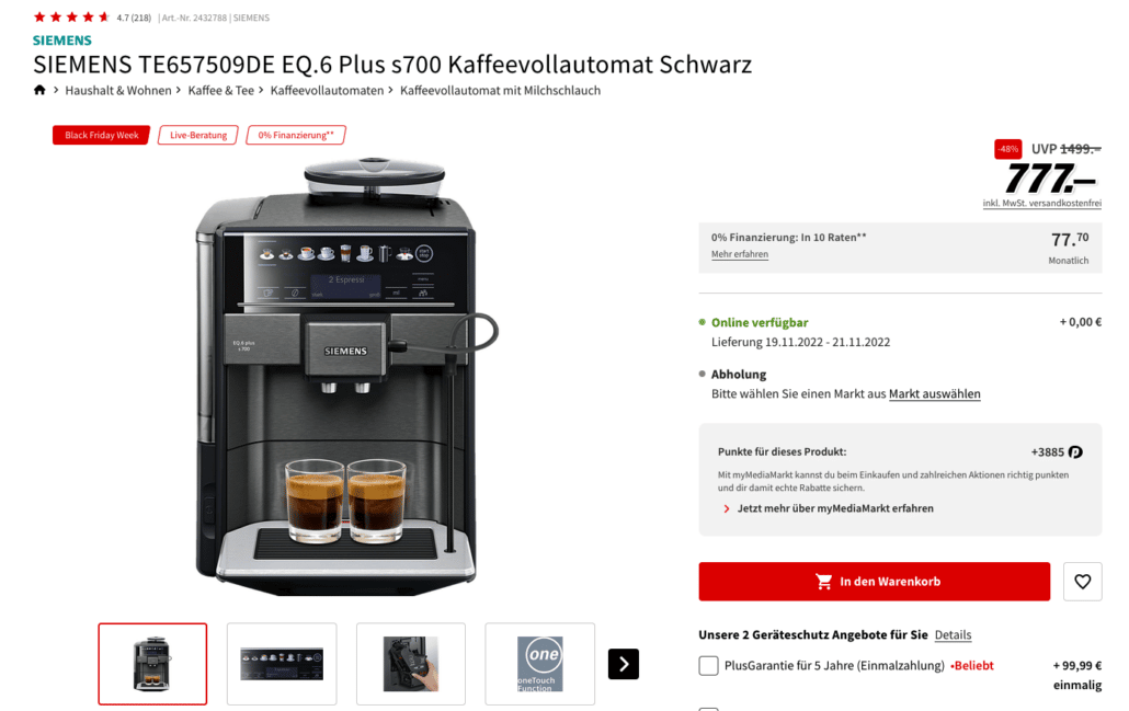 18.11.22 (12:07 Uhr): 777 Euro für SIEMENS Kaffeevollautomat
