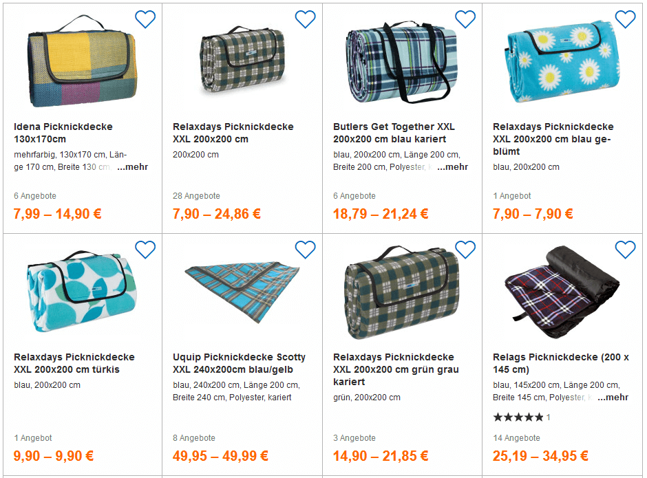 Auf idealo haben wir eine Suche nach „Picknickdecke“ für Sie durchgeführt. Dort finden Sie sicher genau die richtige Decke für sich und Ihre Familie oder Freunde.