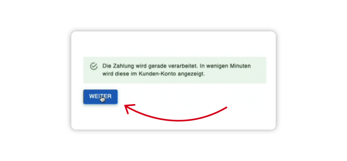 6. Ein Bestätigungsfenster zeigt Ihnen an, dass die Zahlung erfolgte. Klicken Sie hier auf „weiter“.