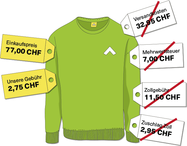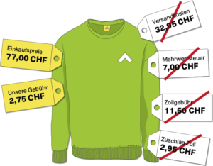 Ein grüner Pullover mit verschiedenen Preisetiketten, zeigt das Einsparpotenzial einer deutschen Lieferadresse