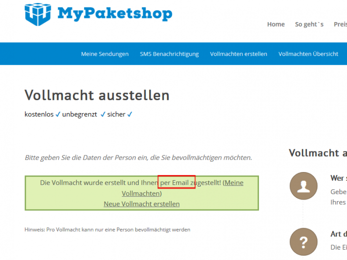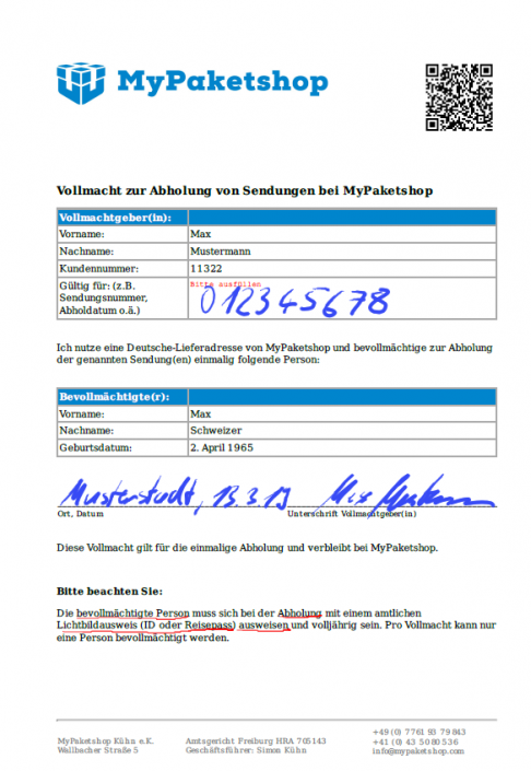 Vollmachten erlauben es Bekannten oder Verwandten Ihr Paket bei uns abzuholen. Im Folgenden erläutern wir das Ausstellen einer Einzelvollmacht. Einen ausführlichen Artikel zum Thema „Vollmacht erstellen“ haben wir hier für Sie vorbereitet.