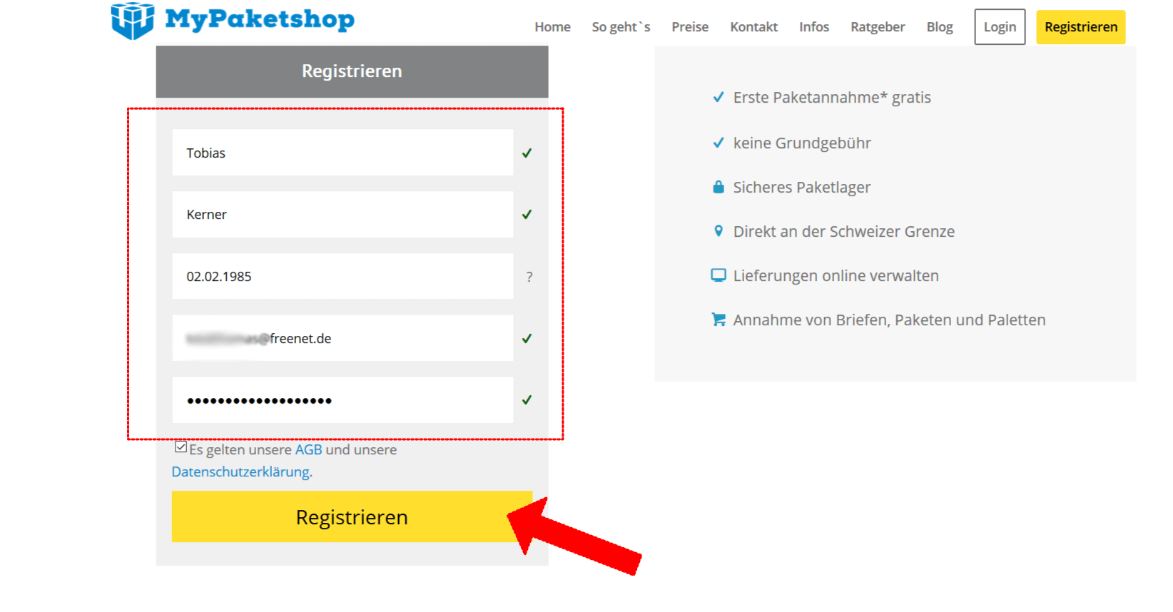 Registrierformular von MyPaketshop mit ausgefüllten Feldern.