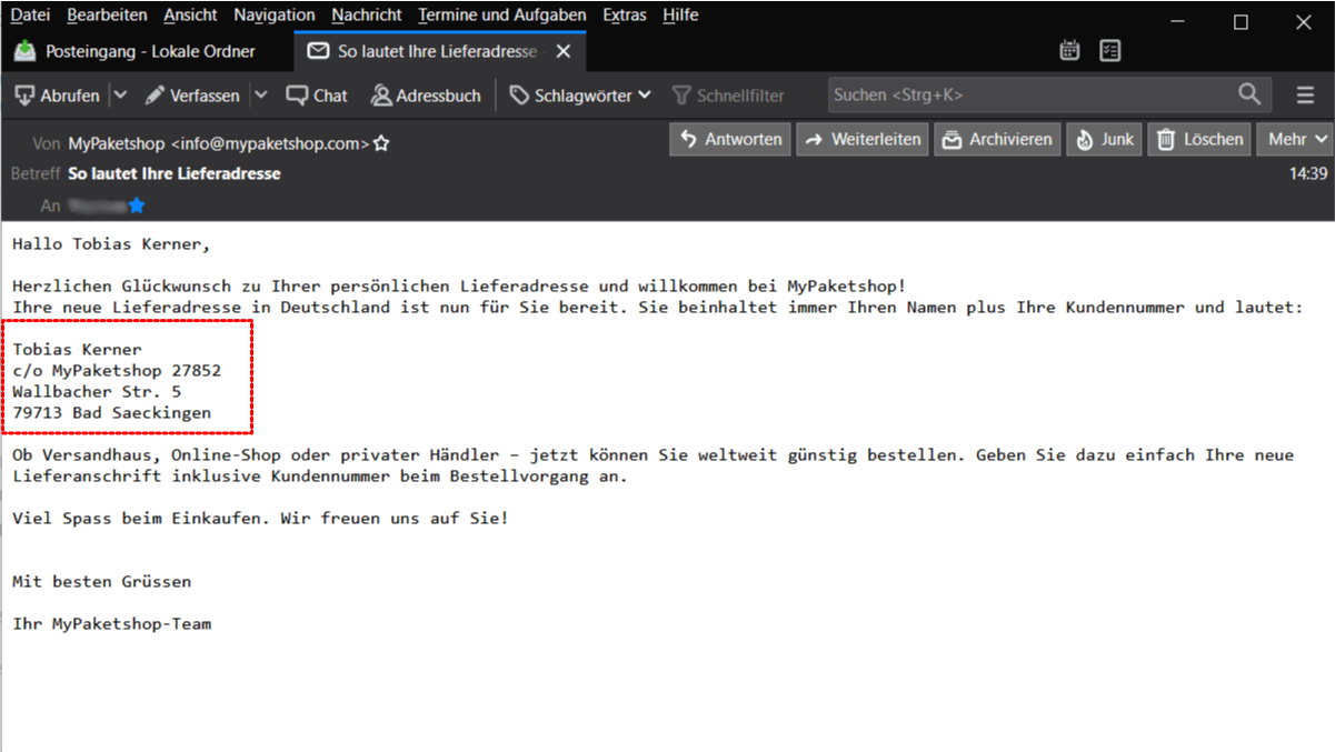 Du bist hier: Startseite1 / Test2 / Kurzanleitung: So gehts nach der Registrierung bei MyPaketshop weiter3 / Schritt-6-Mail-mit-Lieferadresse