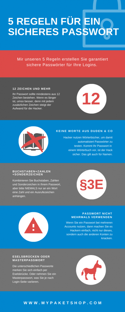 Gut, die Regel Passwörter niemals mehrmals zu verwenden, lässt sich nur schwer umsetzen, denn immerhin wird praktisch überall ein Passwort gebraucht. Wer soll sich das alles merken? Bauen Sie deshalb ein so genanntes Masterpasswort. (Wie das geht, verraten wir gleich). Das Masterpasswort ergänzten Sie durch ein für die Webseite spezifisches Passwort. Bei MyPaketshop könnte das Anhängsel etwa „PaAbbis19!“ lauten.