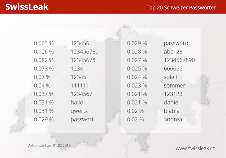 Bitte verwenden Sie niemals Zahlenfolgen oder das Wort „hallo“ sowie „passwort“ als Passwort. Das Hasso-Plattner-Institut erstellte im Dezember 2017 auf Basis von 368.348 E-Mail-Datensätzen eine Liste mit den beliebtesten Passwörtern der Schweizer. Den ersten Platz gab es für „123456“, ihm folgt „1234“ und den dritten Platz nimmt das Passwort „123456789“ ein. Diese Passwörter kennt jeder Hacker und probiert sie als Erstes aus.