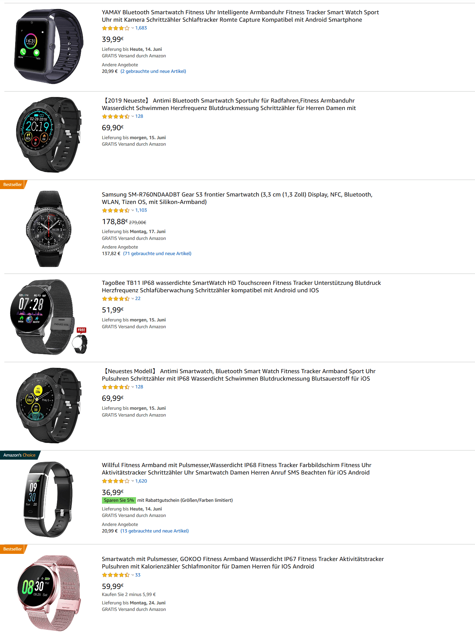 Die ersten 7 Treffer zum Suchwort „Smartwatch“ auf Amazon.de. Nur Samsung ist eine Marke, die uns bekannt ist. (Bild: Screenshot Amazon)