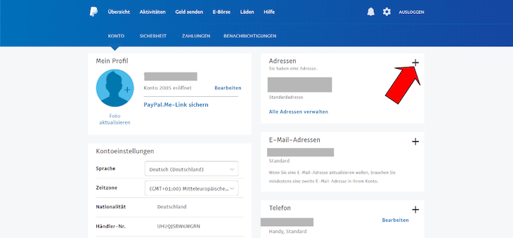 3. In der folgenden Übersicht werden Ihre wichtigsten Daten präsentiert. Auf der rechten Seite, steht unter Adresse Ihre Standardadresse. Das ist in der Regel die Adresse, mit der Sie sich bei PayPal registriert haben. Klicken Sie dort auf das „+“.