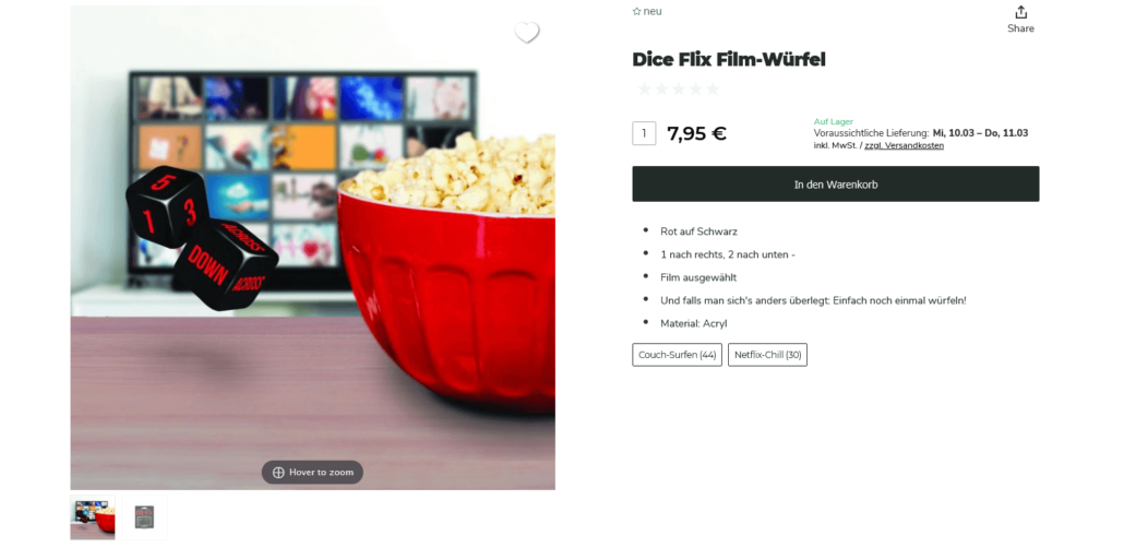 Haben Sie sich auch schon mal diese Frage gestellt? Dann sind diese Würfel die perfekte Lösung. Würfeln Sie eine Zahl und dann den Richtungswürfel. Der bestimmt, in welche Richtung Sie abzählen. Auf diese Art bestimmt der Zufall Ihre nächste Serie, Dokumentation oder den nächsten Film. Das funktioniert natürlich auch bei Prime Video, Disney+ und wie sie alle heissen.