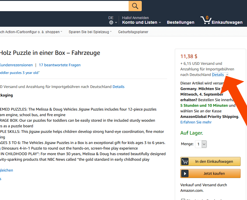 Amazon.com führt die voraussichtlichen Zollgebühren auf. Klicken Sie dazu auf Details.