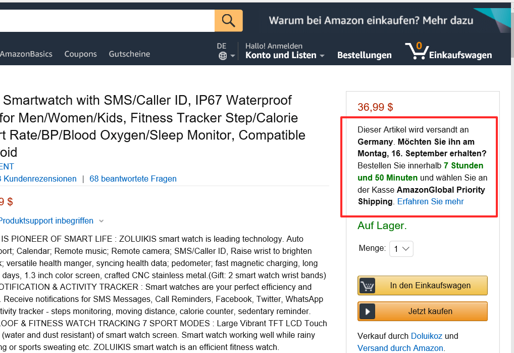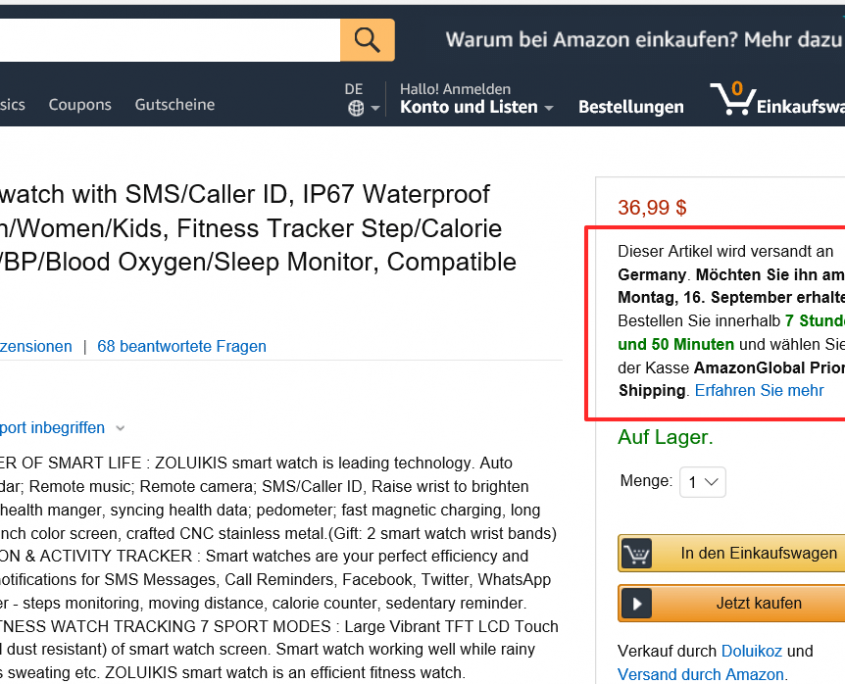 Amazon zeigt bereits in der Artikelansicht an, bis zu welchem Datum Sie mit der Lieferung nach Deutschland rechnen können.