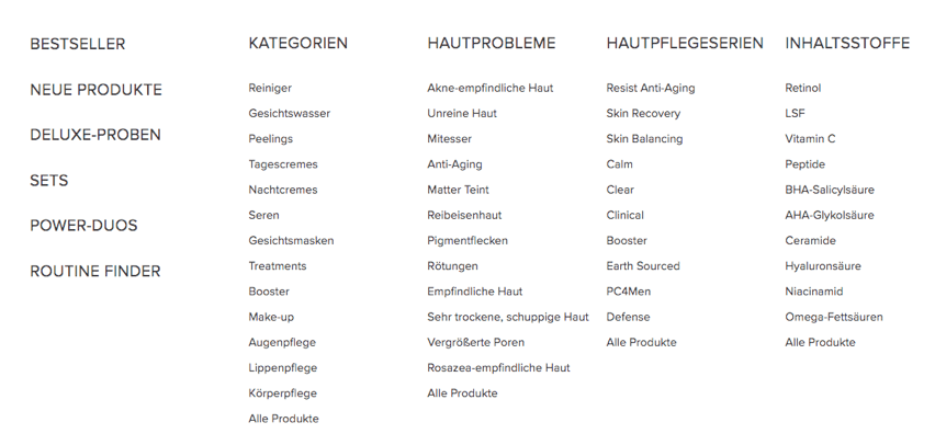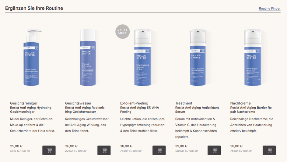 Wissen Sie nicht genau, was Sie für Ihre Hautpflege benötigen, wählen Sie die Rubrik „Routine-Finder“ (linke Seite unterster Punkt). Dort gibt es einen kurzen Test, der passende Produkte zur gewünschten Pflegeroutine ausweist.