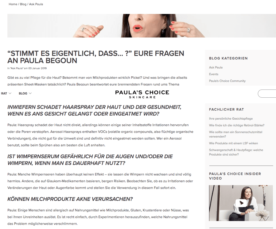 Neben der eigenen Produktlinie präsentiert das Fachberatungsteam von Paula’s Choice sehr viele nützliche Informationen, Tipps, Ratschläge und Fakten rund um das Thema Hautpflege.