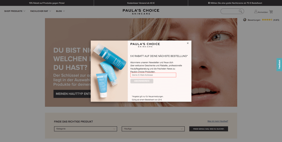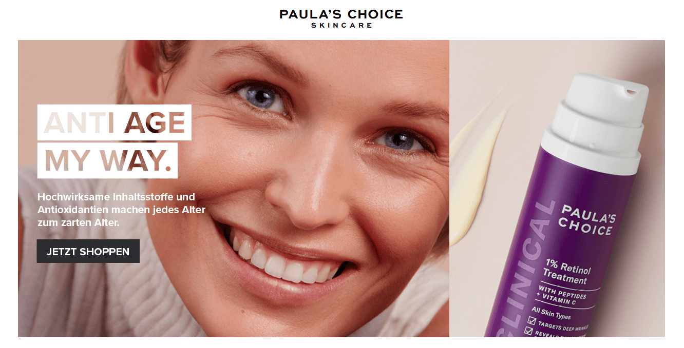 Kein Zweifel: Wer die Startseite des Onlineshops Paula’s Choice aufruft, erkennt sofort, dass es hier um Hautpflege geht. Bildlich und textlich steht dieses Thema im Fokus. Insgesamt wirkt der Onlineshop klar, zurückhaltend und pur – so wie auch die Produktpalette vermarktet wird. Auf alles Unnötige wird verzichtet.