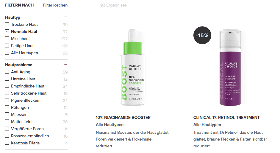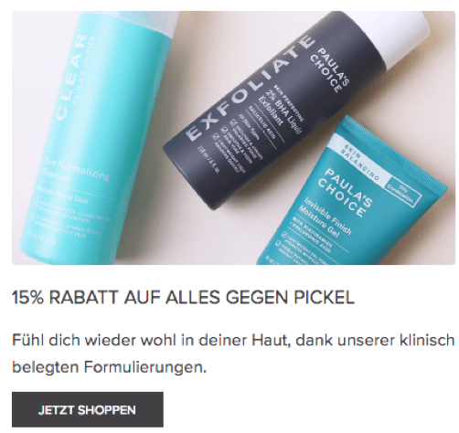 Es gibt auf dem Onlineportal von Paula’s Choice wechselnde Rabatt-Aktionen. Produkte einer Kategorie werden ausgewählt und für einen gewissen Zeitraum zu einem reduzierten Preis angeboten.