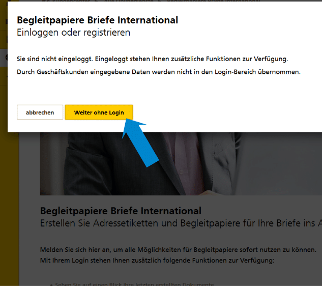 Zollinhaltserklärung CN22 -ohne Login fortfahren