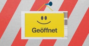 Gelbes Schild mit „Geöffnet“ Aufdruck sowie einem Smiley