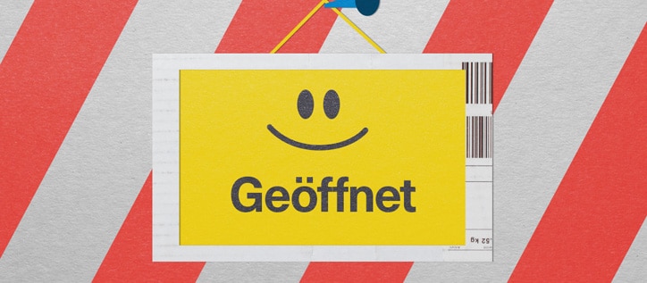 Schild mit „Geöffnet“ Aufdruck sowie einem Smiley