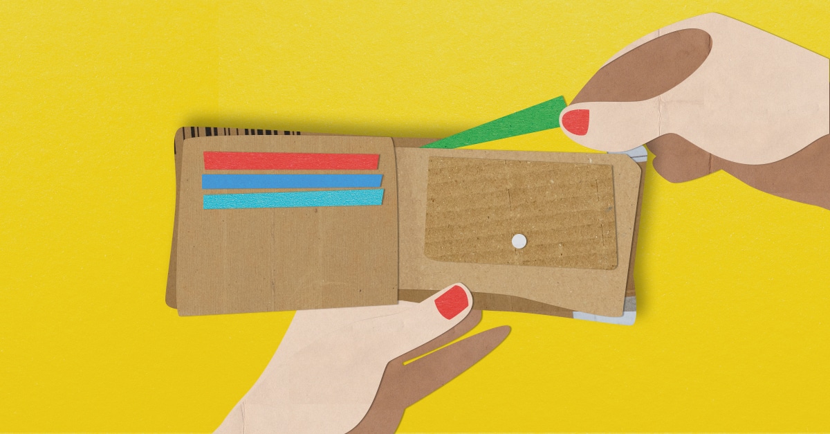 Portmonee mit Geld und Hand die es herauszieht.